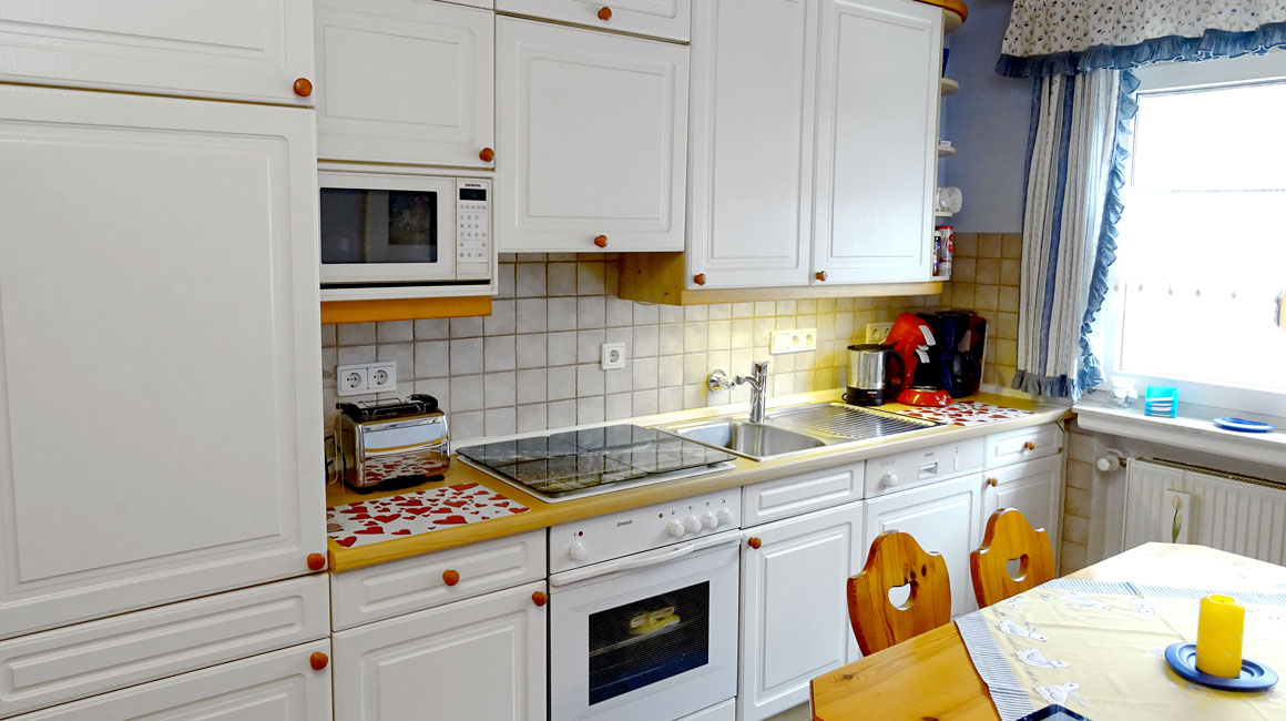 Vier-Plattenherd mit Backofen, Kühlschrank mit Eisfach, Kaffemaschine, SENSEO-Kaffepadmaschine, Mikrowelle, Wasserkocher sind selbstverständlich vorhanden.